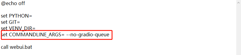 - 在COMMANDLINE_ARGS中增加”–no-gradio-queue”,具体语法如下: