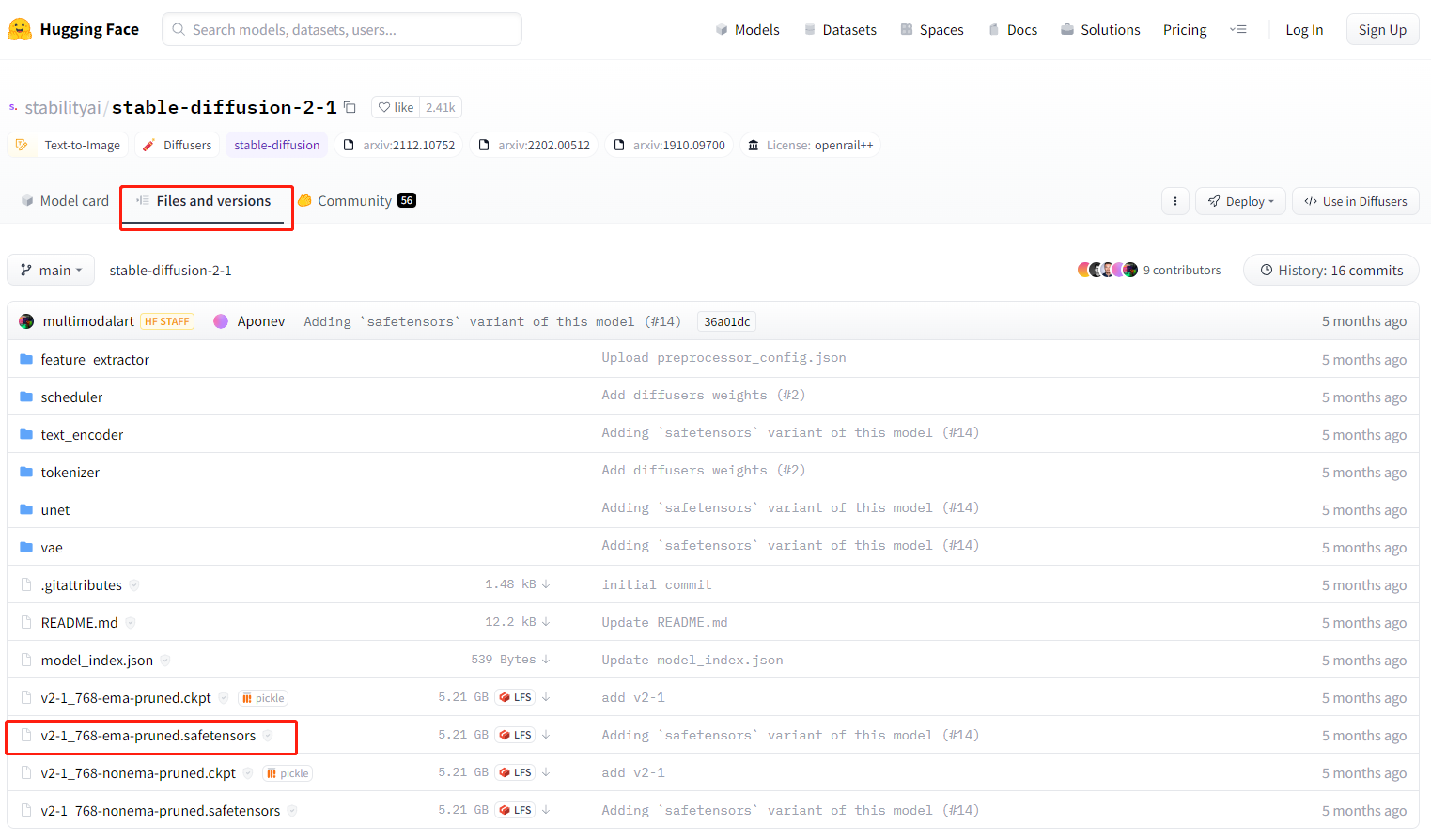 本文以Stable Diffusion官方的2.1模型为例,在HuggingFace中搜索”stable-diffusion-2-1”,或者访问以下地址:https://huggingface.co/stabilityai/stable-diffusion-2-1/tree/main 其中会有多个版本的模型可以下载,但是对于初学者来说,用哪个版本区别并不大。我们这里选择”Files and versions”中”v2-1_768-ema-pruned.safetensors”文件进行下载,将下载好的模型放在D:\playground\stable-diffusion-webui\models\Stable-diffusion 文件夹中,这样该基础模型就可以被选择加载到你的webui里面了。