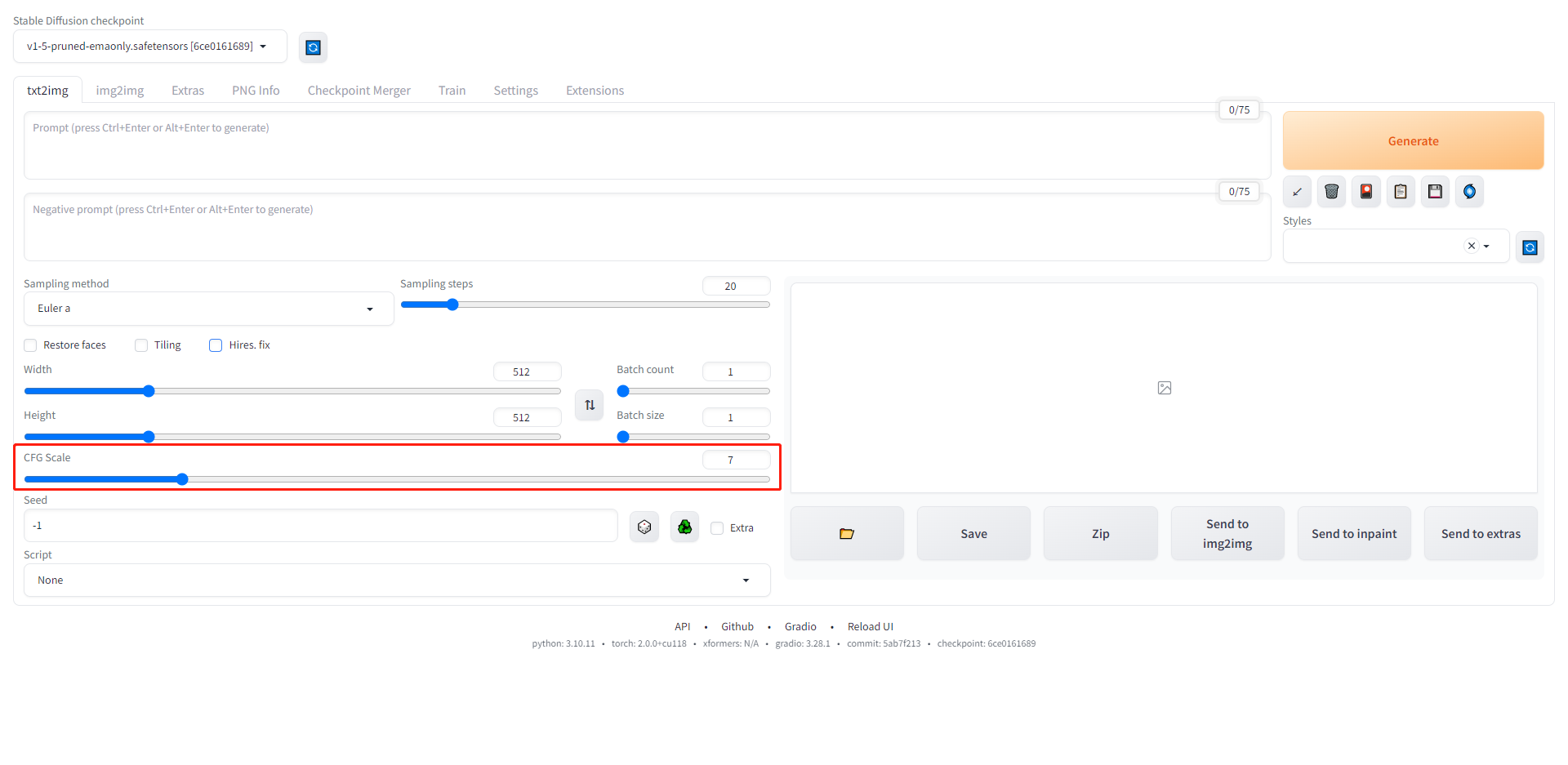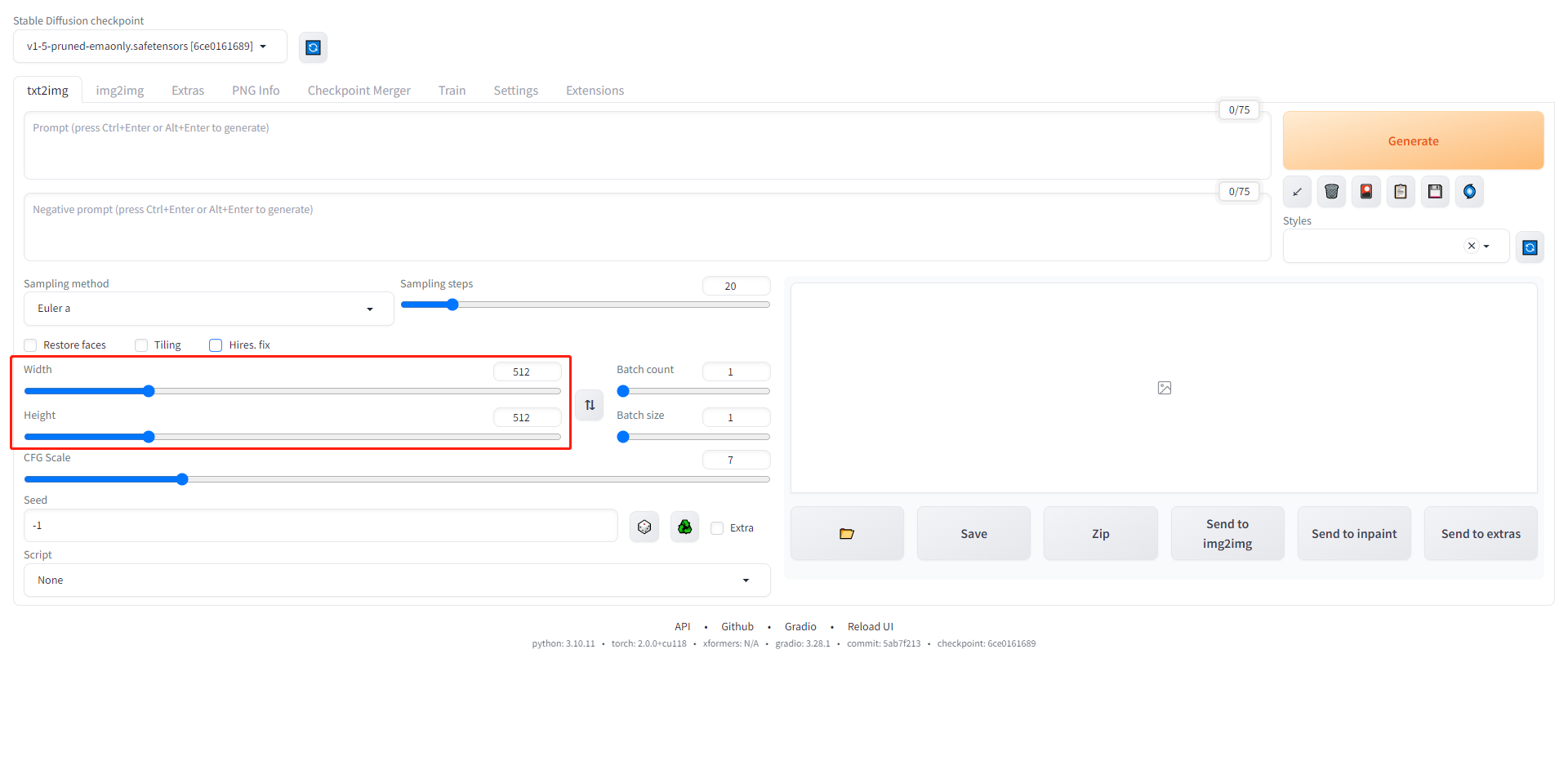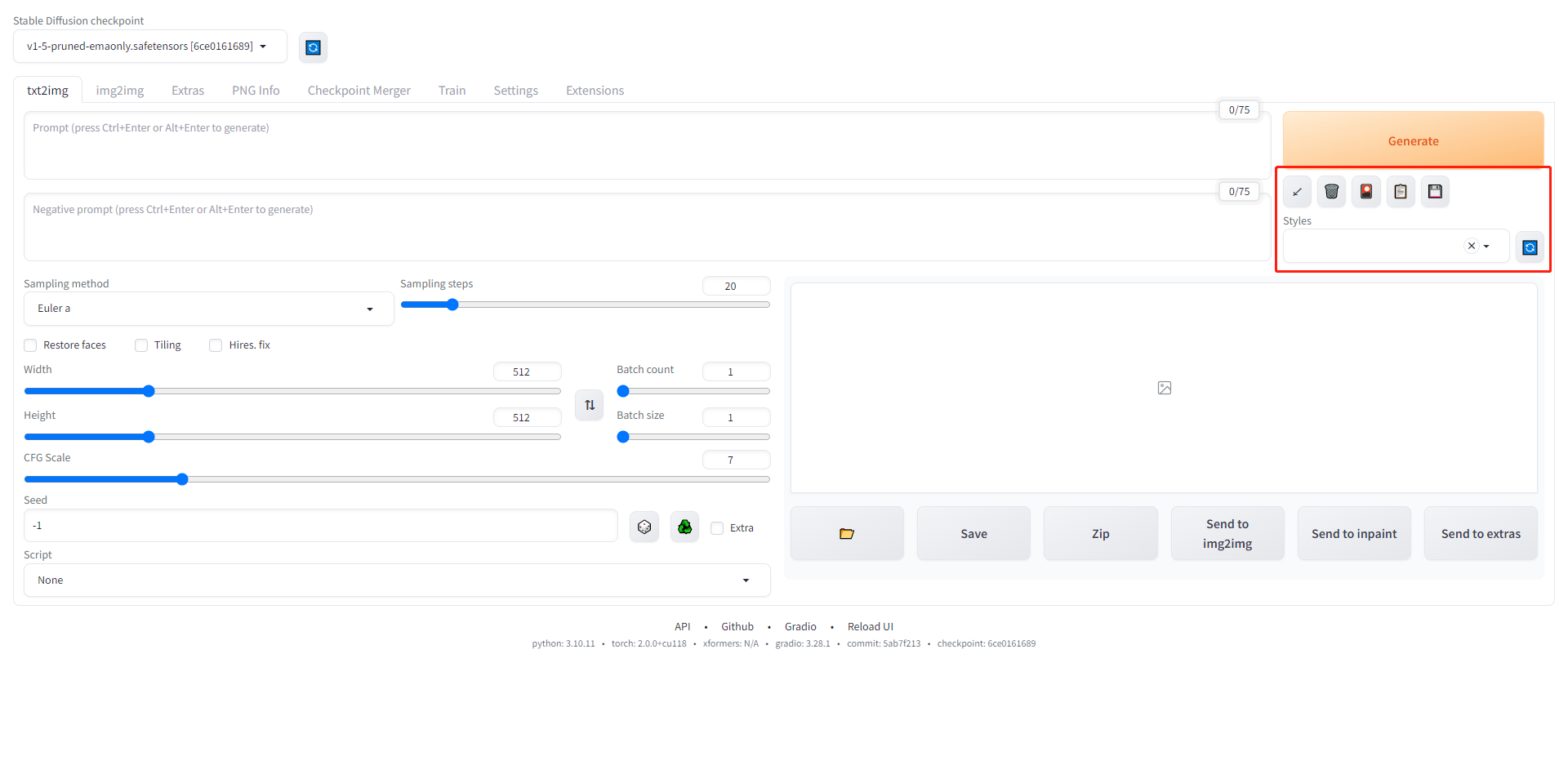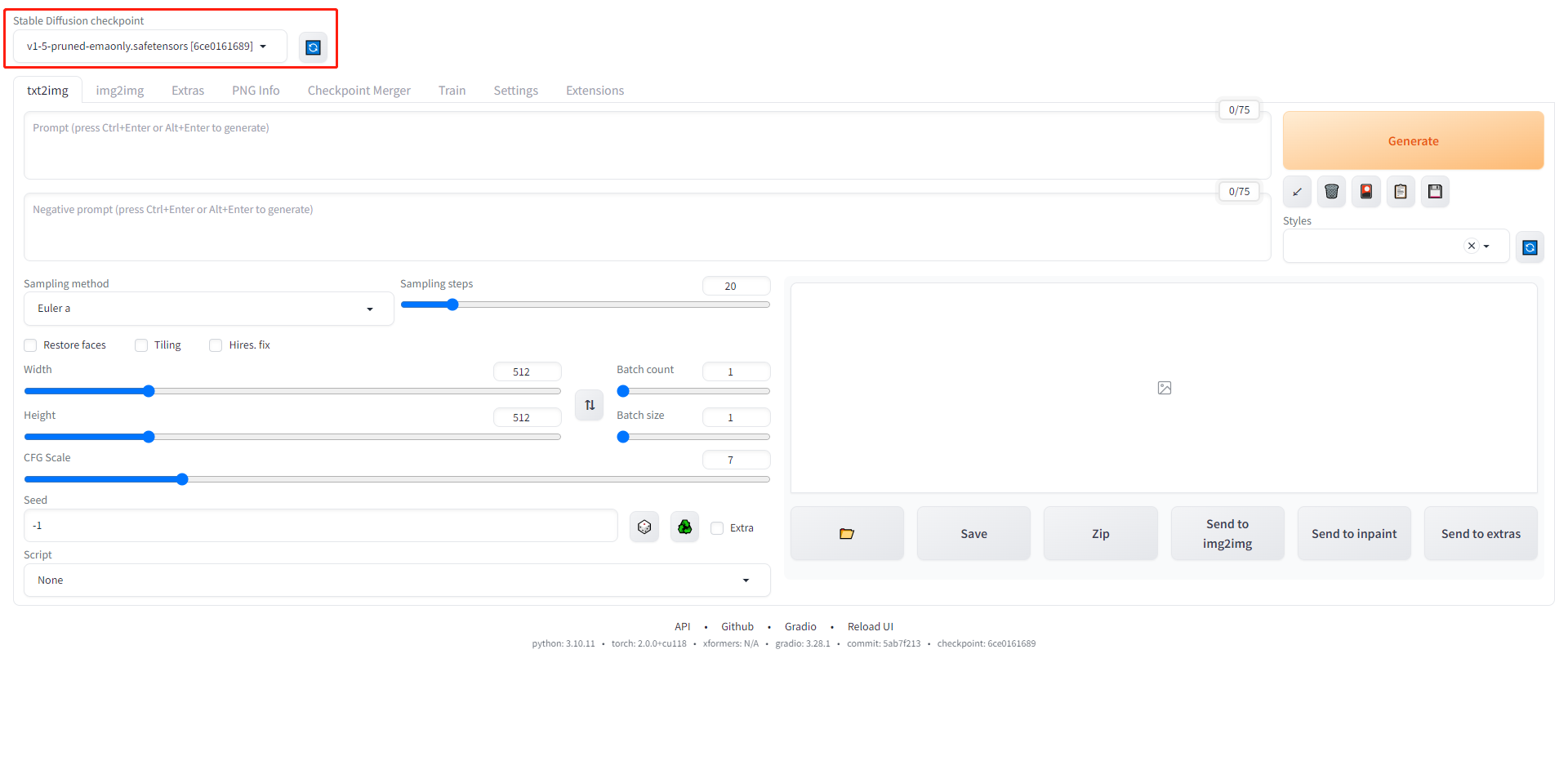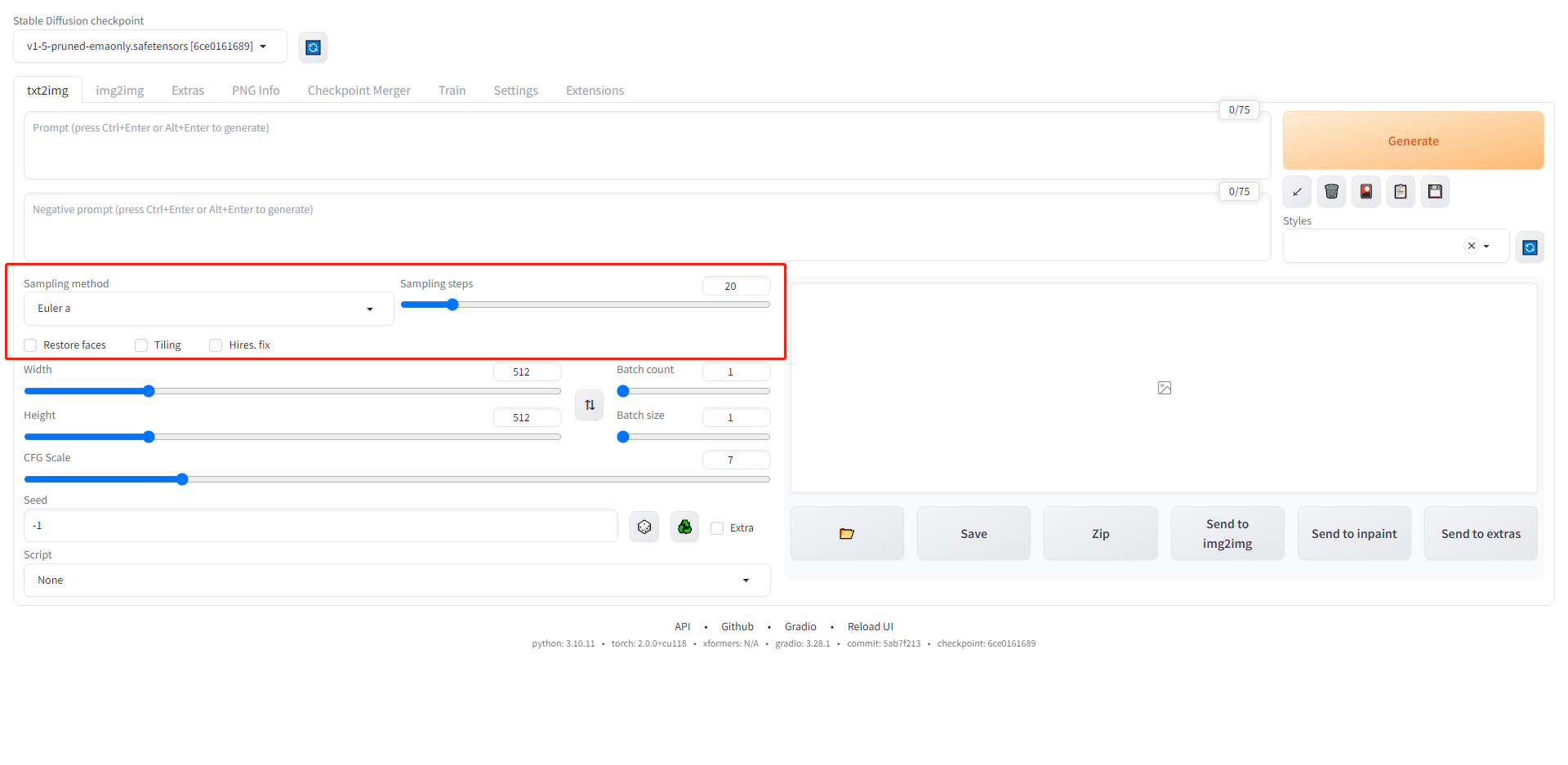 左上角显示的是你当前加载的基础模型,可以从这里进行切换,中间区域就是常用的基本功能模块。 本文主要介绍txt2img的基本参数使用。