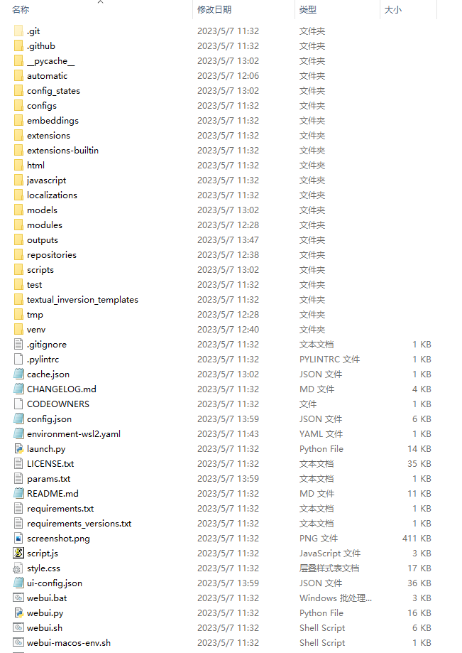 整个stable-diffusion-webui项目安装完成后将会形成一个这样的目录