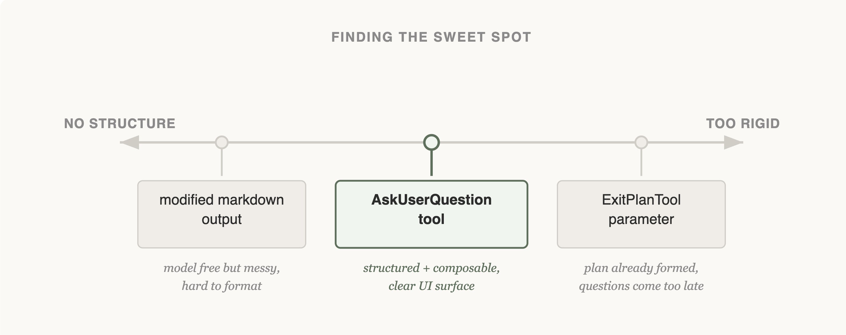 我们首先尝试的是在 ExitPlanTool 中添加一个参数,让问题数组与计划一起出现。这是最容易实现的方案,但它让 Claude 感到困惑,因为我们同时要求提供计划和对计划的一组问题。如果用户的回答与计划内容冲突怎么办?Claude 需要调用两次 ExitPlanTool 吗?我们需要另一种方法。